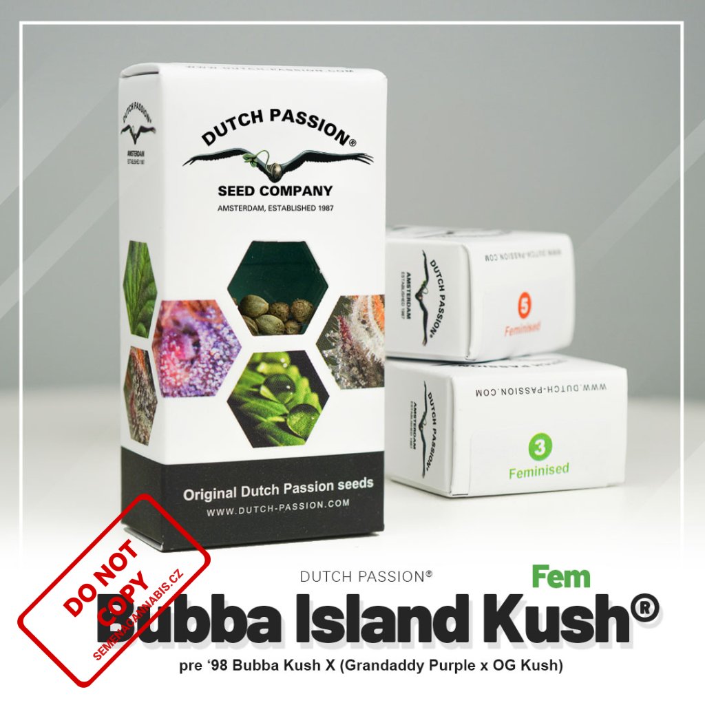Tato prémiová a silná Kush genetika přichází ze Severní Ameriky křížením (Grandaddy Purple x OG Kush) s vráceným samcem Pre 98 Bubba Kush. S její průměrnou výškou 1 metr s rychlým 7,5týdenním obdobím kvetení a kyselými a ovocnými kushovými tóny, je Bubba Island Kush speciální Kush přídavkem do sbírky Dutch Passion.